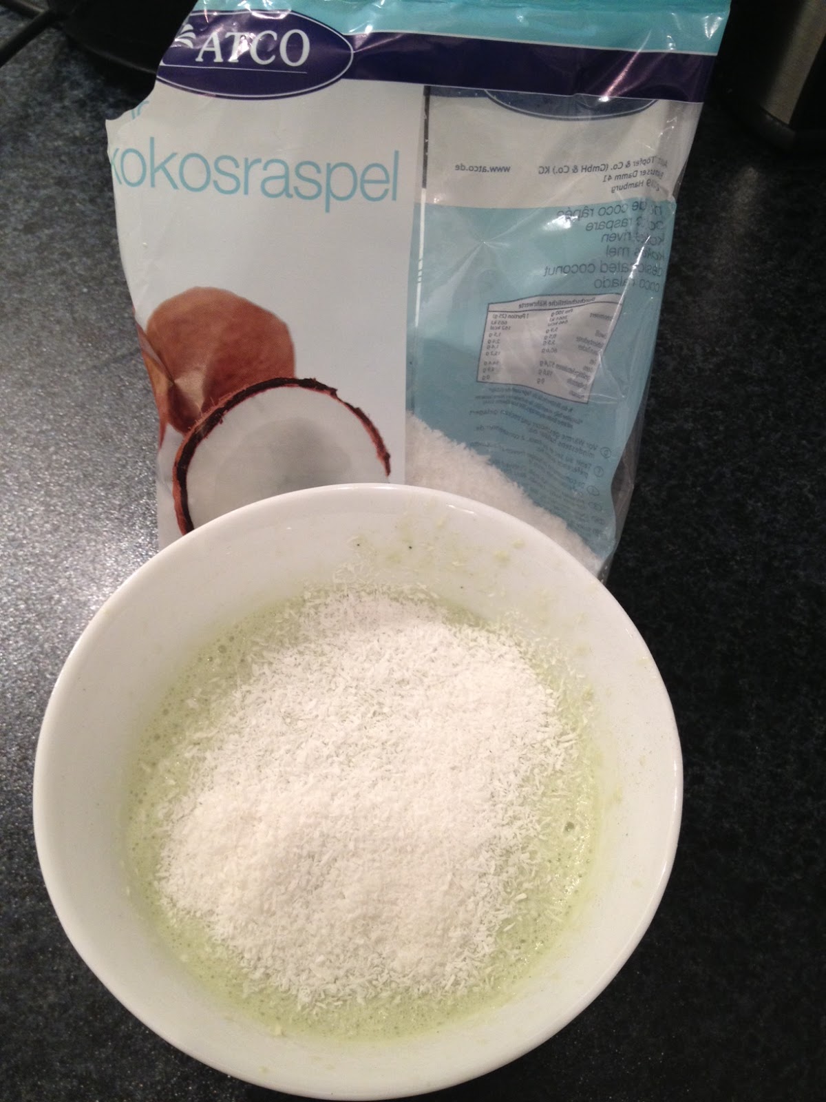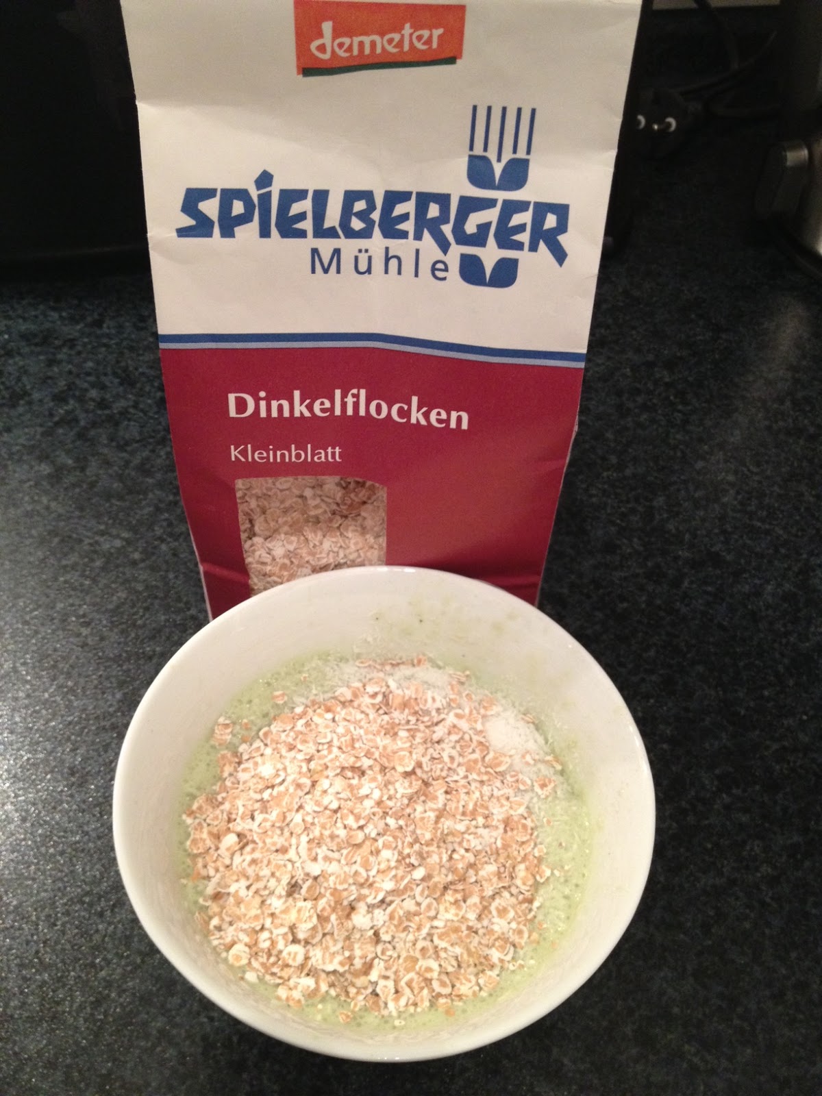 - Kokosflocken und Dinkelflocken hinzugeben und ca. 1-2 Minuten einweichen lassen.