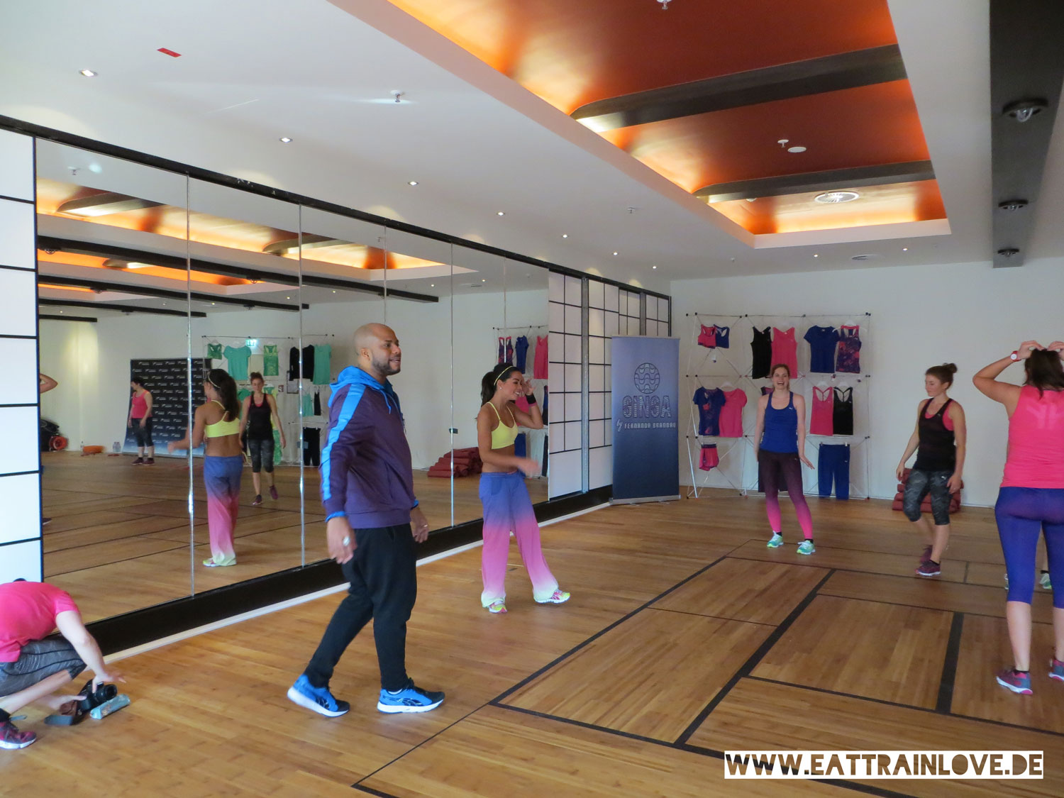 Als nächstes wagten wir uns an ihr GINGA Workout. Natürlich in unseren neuen PUMA Sportsachen. Super schön fand ich, dass wir Mädels alle andere Sachen aus der neuen Kollektion bekamen und auch untereinander tauschen durften. Hatte ein bisschen was von Germany’s Next Topmodel! :-) Fernanda erklärte uns zunächst, wie sie das GINGA Kursformat entwickelt hat. Als Mischung aus Capoeira, Kraftübungen und Tanzelementen ist GINGA sehr kraftvoll und schweißtreibend! Passt super zu dieser Powerfrau und man nimmt ihr sofort ab, dass sie absolut hinter ihrem GINGA steht! Wir absolvierten mit ihr einen Part aus ihrer zweiten GINGA-DVD, die im Laufe diesen Jahres auf den Markt kommt. Ein wesentlicher Bestandteil war: Das Springseil! Zuvor hatten uns die Organisatorinnen versichert, dass es nicht so anstrengend wird, aber das sah nach 15 Minuten Workout schon ganz anders aus. Die Gesichtsfarbe veränderte sich bei den meisten von uns ins Rötliche! Einzig und allein Fernanda sah auch nach dem Workout noch perfekt gestylt und total entspannt aus.