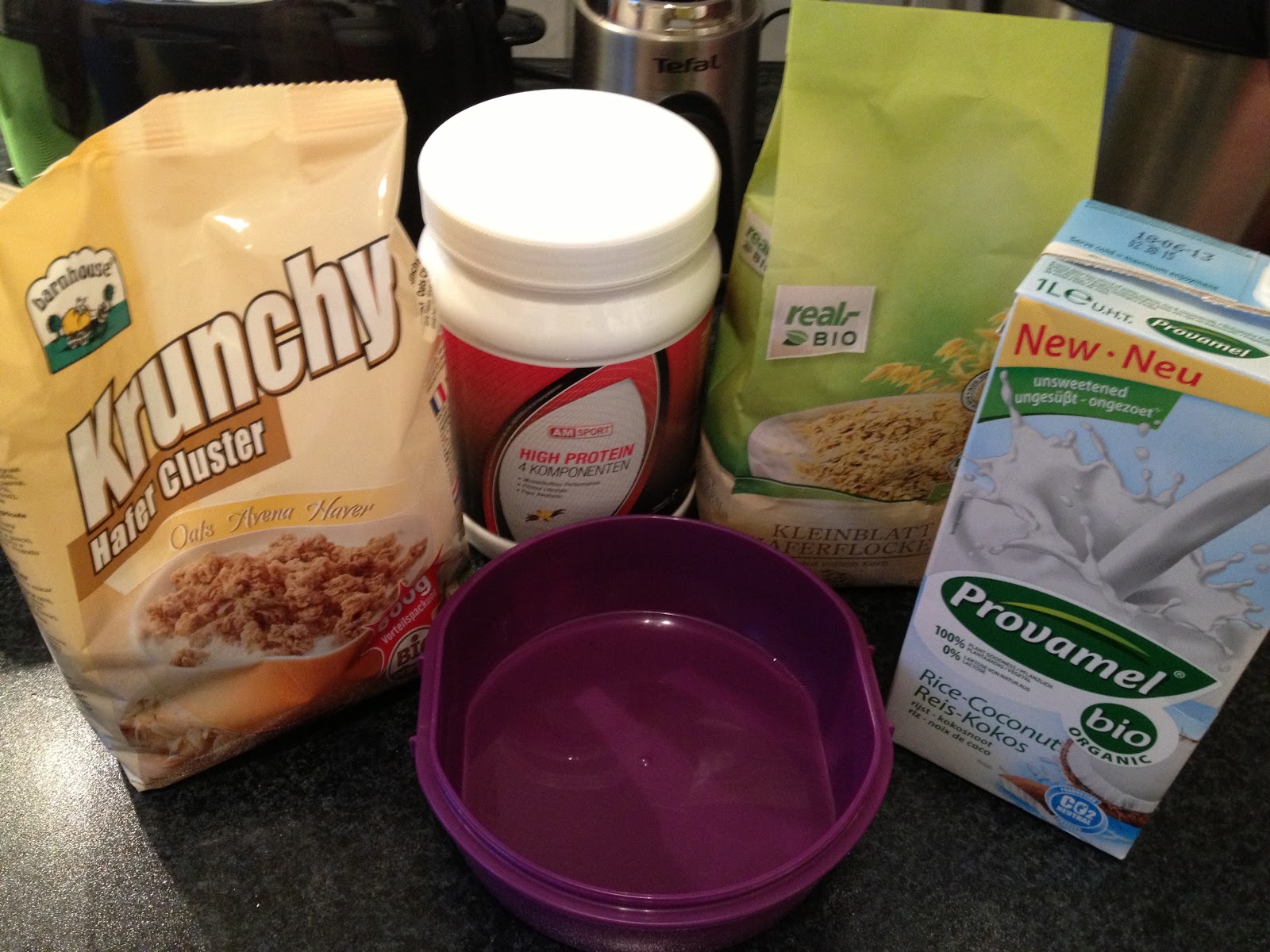 Zuhause noch schnell zubereitet: 1 EL Eiweißpulver, Reismilch, Hafer-Crunchies,
