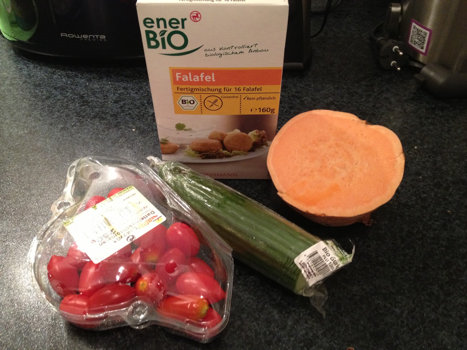 Bio-Falafel-Mischung, Tomaten, Gurke und Süßkartoffel