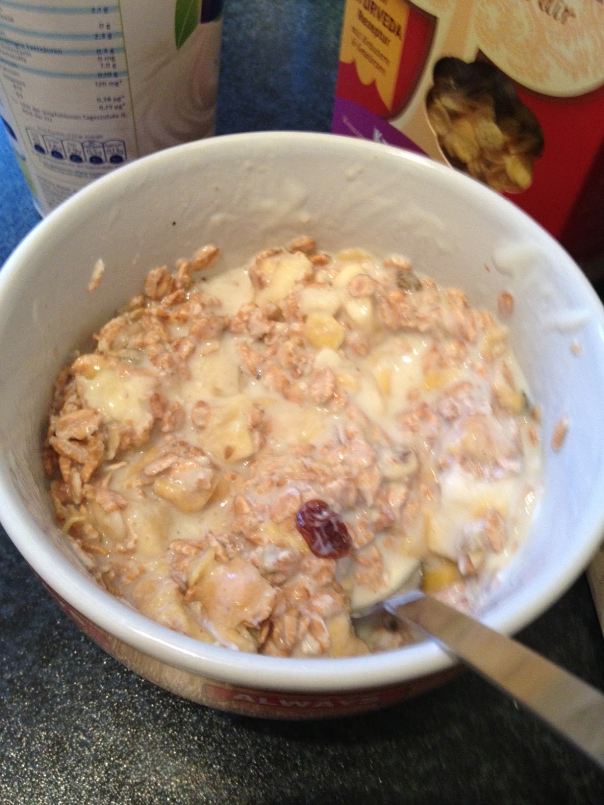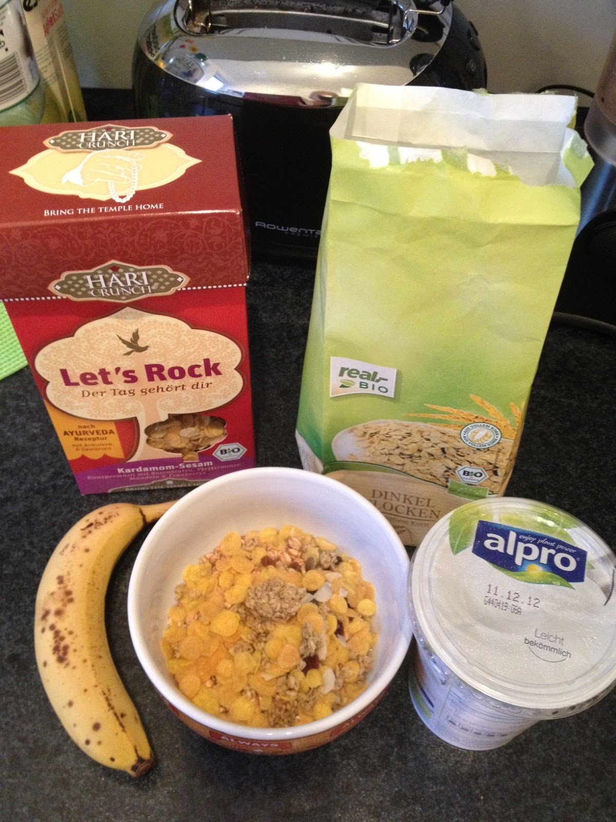 | Oatmeal mit Dinkelflocken, ayurvedischer Müslimischung, Banane, etwas heißem Wasser und Sojajoghurt |