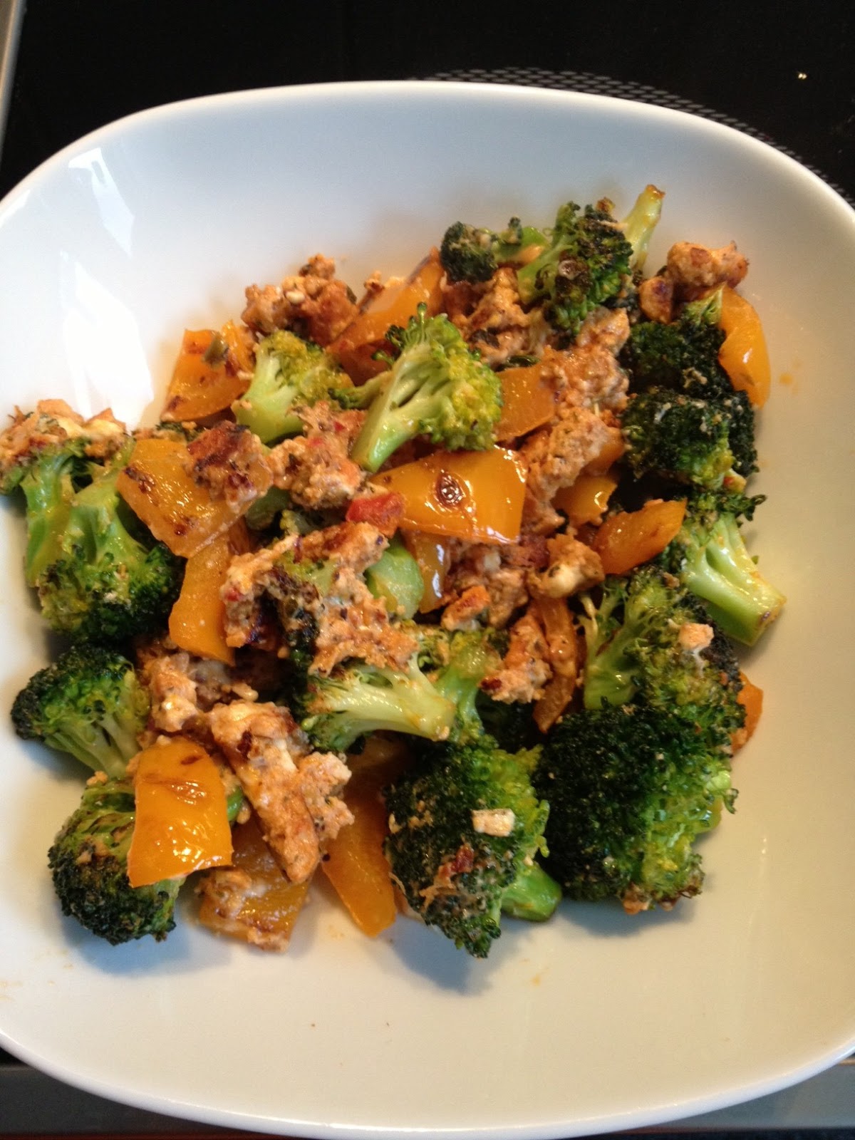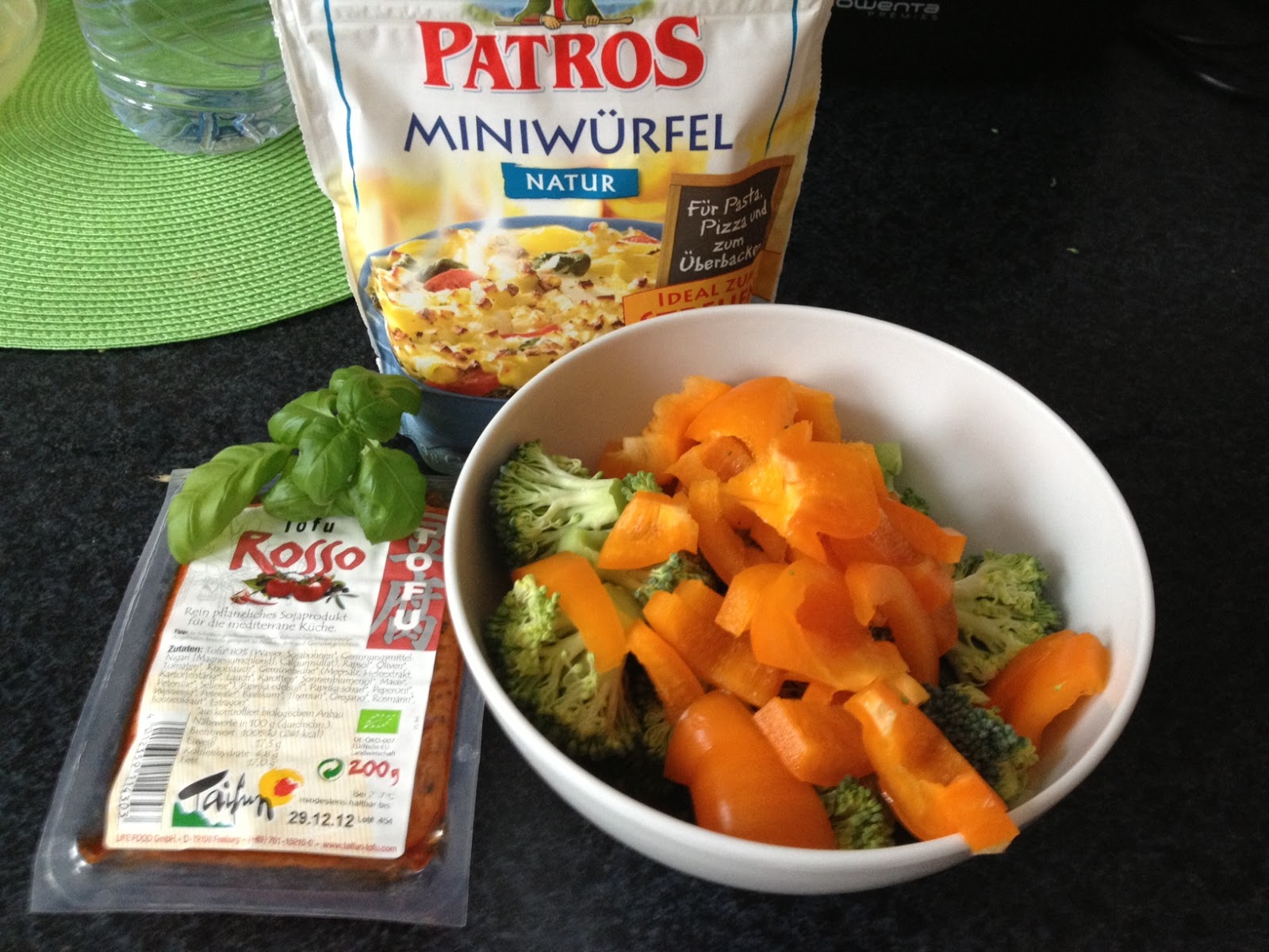 | Eigenkreation aus Tofu Rosso, Paprika, Brokkoli und ein paar Fetakäsewürfeln. Gewürzt mit frischem Basilikum, Salz und Pfeffer. |