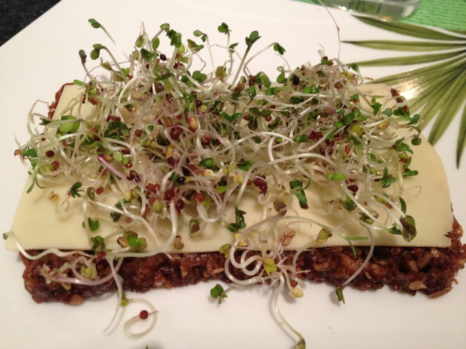 | Körniges Schwarzbrot mit 1 Scheibe Käse und Sprossenmix (Alfalfa und Brokkoli) |