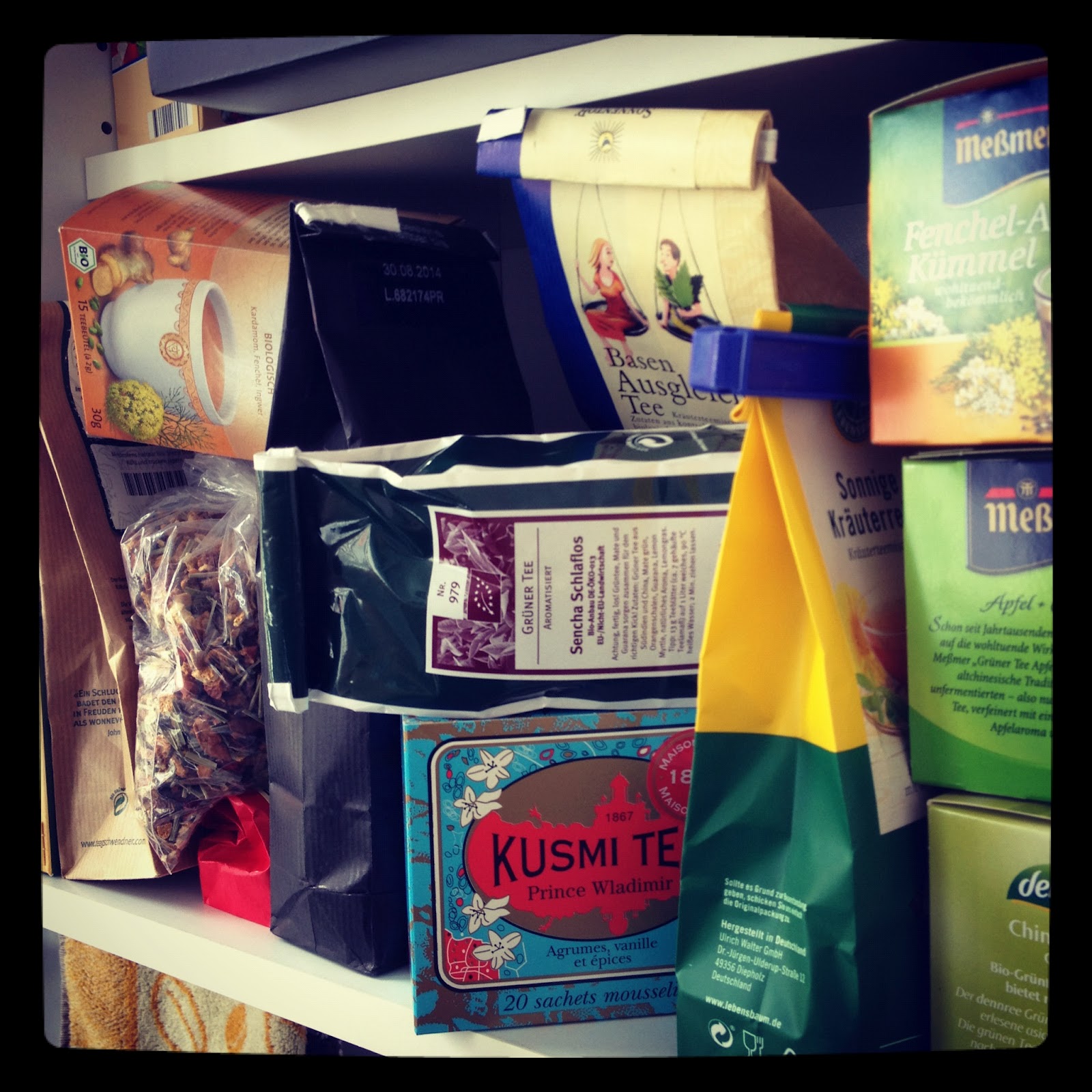 Diesen Schreckzustand erreiche ich dafür inzwischen in unserem Teeschrank. Wenn ich mir mal einen Tee machen will (bevorzugt einen Schwarzen), dann muss ich diesen erstmal finden. Mein Blick schweift vorbei an Sencha-Tee über Stevia in jedem Aggregatzustand bis hin zu rosa Elefanten. Spätestens dann bin ich überzeugt, dass ich wieder ins Bett gehen sollte und lege mich wieder schlafen…