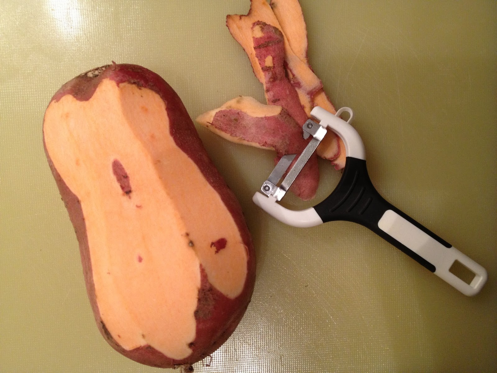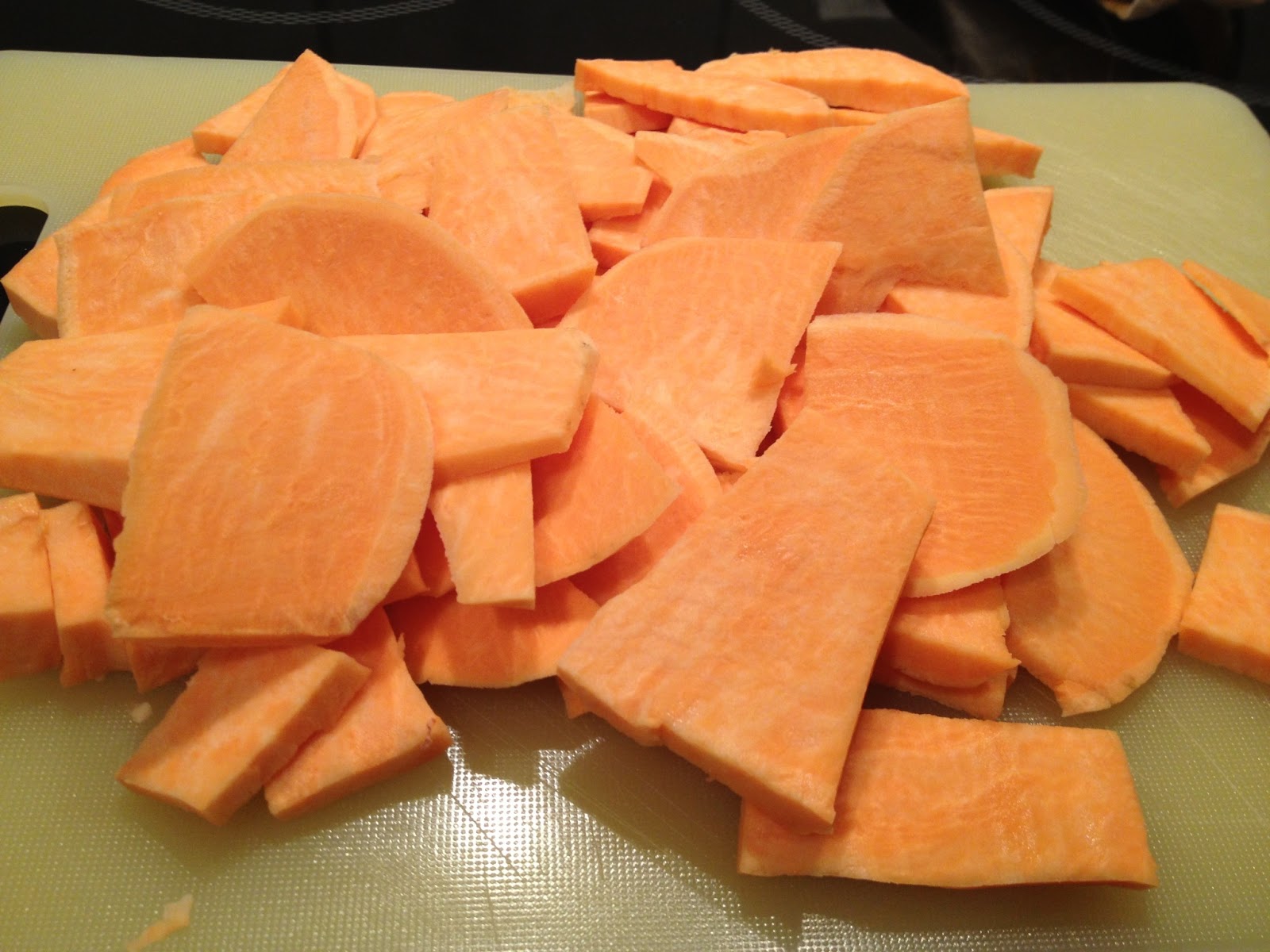 - Während der Rosenkohl im Ofen ist, die Süßkartoffel in Bratkartoffelscheiben schneiden.