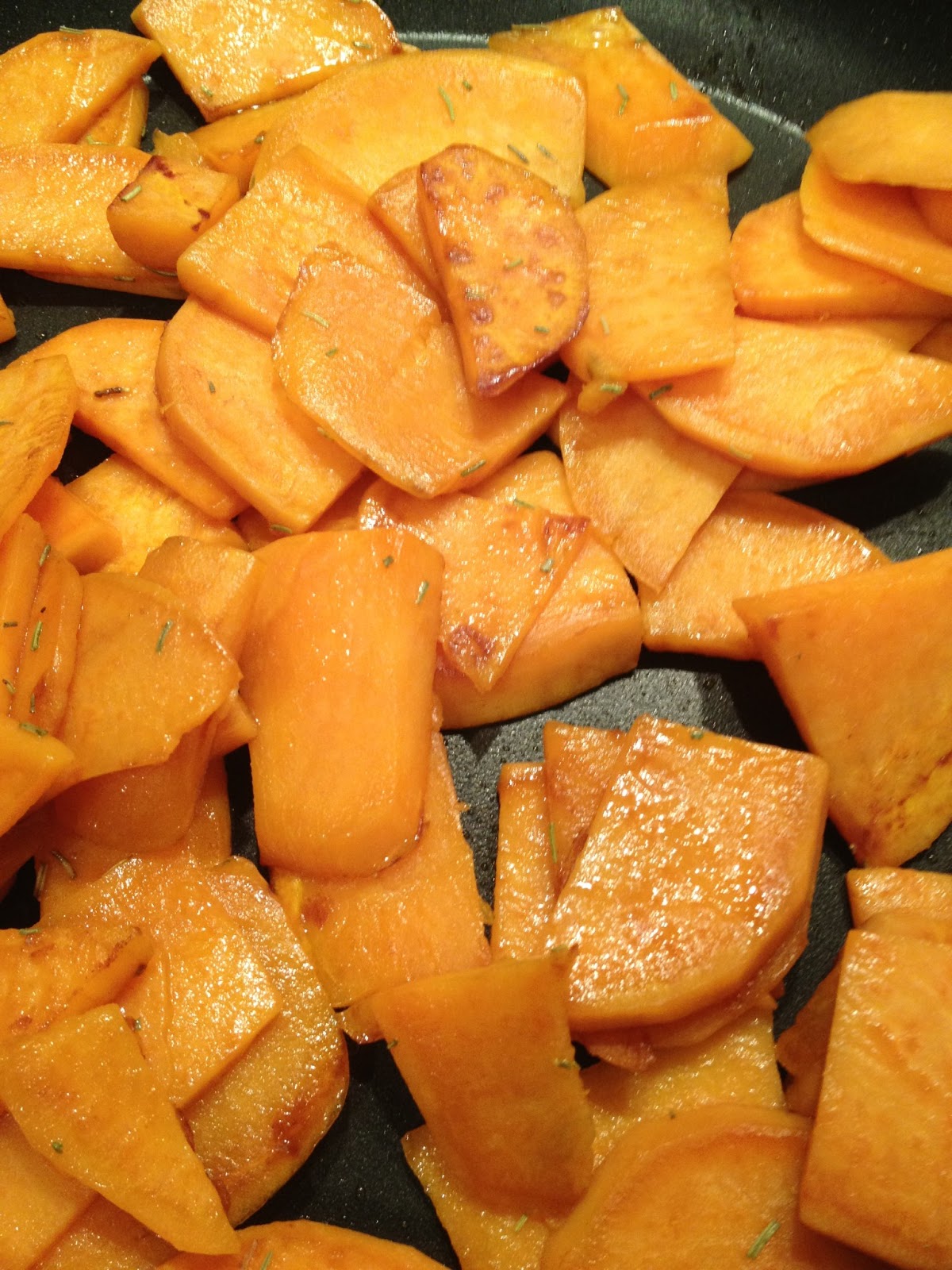 - Die Süßkartoffeln in einer Pfanne mit Olivenöl bei mittlerer Hitze goldbraun braten. Dies dauert ca. 10 Minuten.