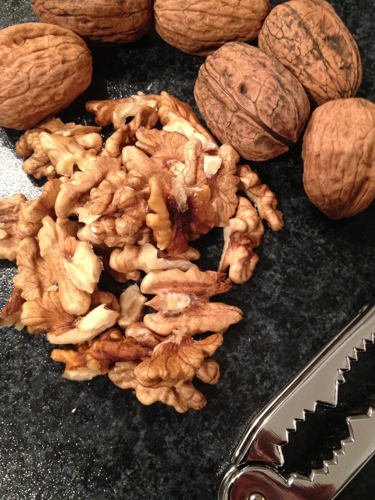 - Dann kommt das Crumble: Dafür 1/2 Becher Walnüsse, 1 TL grobes Meersalz und 1/2 TL Pfefferkörner in einer Küchenmaschine oder einem Mixer zermahlen. Anschließend die Krümel noch mal mit 3 EL Olivenöl vermischen.